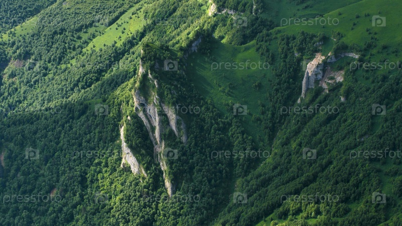 Камни, торчащие из невысокого леса в горах. Горы, покрытые зеленой травой. Красивые величественные скальные выступы на склоне горы. Вид сверху