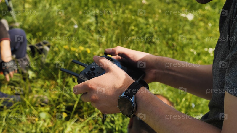 Крупный план рук оператора дрона. Мужчина использует джойстик для управления квадрокоптером на природе. БПЛА, беспилотный летательный аппарат