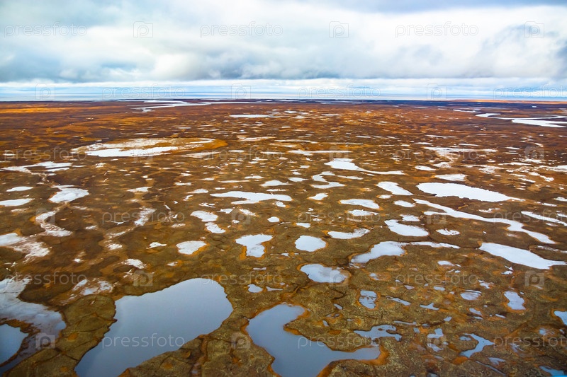 Фотосъемка с вертолета в Арктике. Осенний природный ландшафт северной тундры. Пейзаж из множества озер, рек, пестрых мхов и лишайников. Хмурое осеннее небо