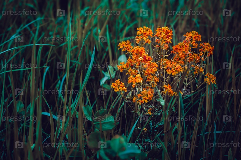 Желтые цветы растут среди зеленой травы