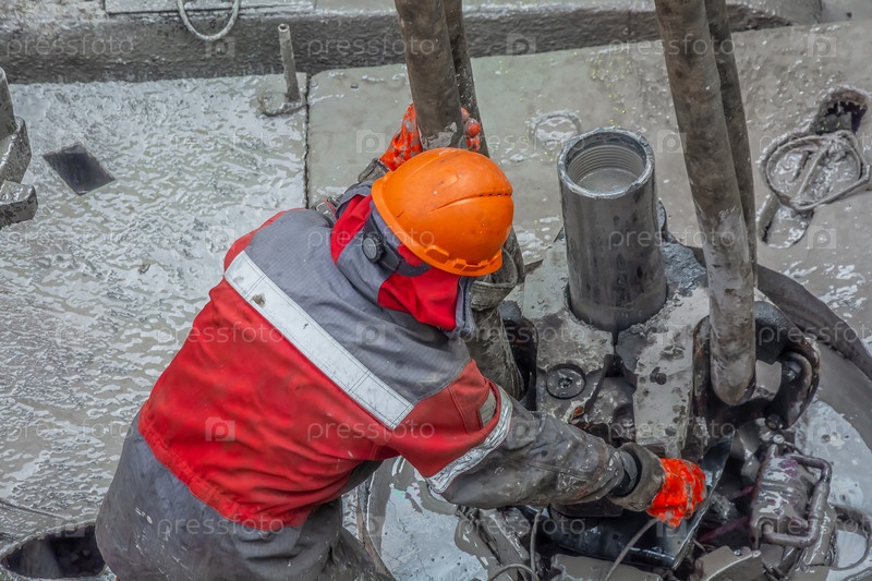Рабочий бурильщик в красной форме, в каске и очках. Он с помощью лифта подвешивает бурильные трубы, чтобы поднять их из нефтяной скважины и продолжить ее бурение. Понятие работающего человека