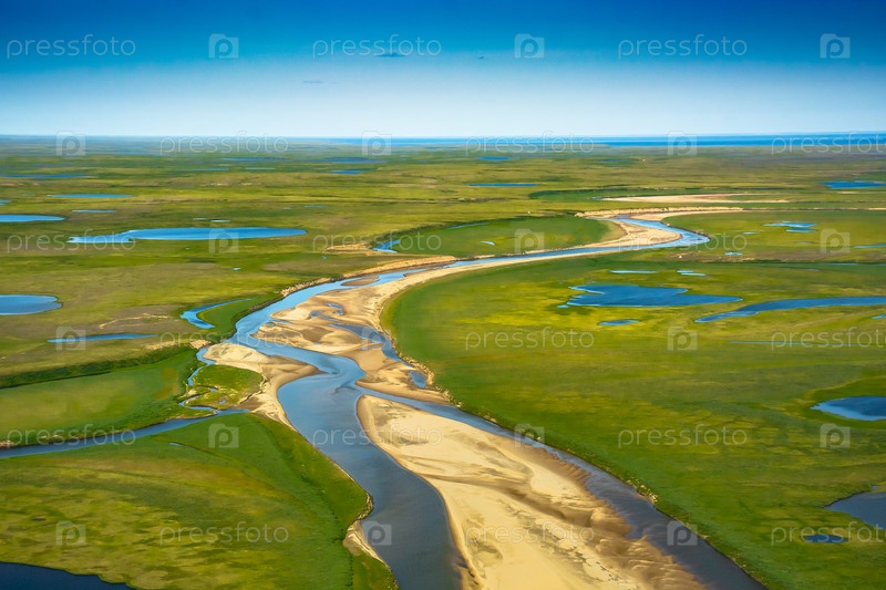 Пейзаж арктической тундры летом. Реки, озера, северная растительность. Вид сверху. Концепция изменения климата, потепление в Арктике