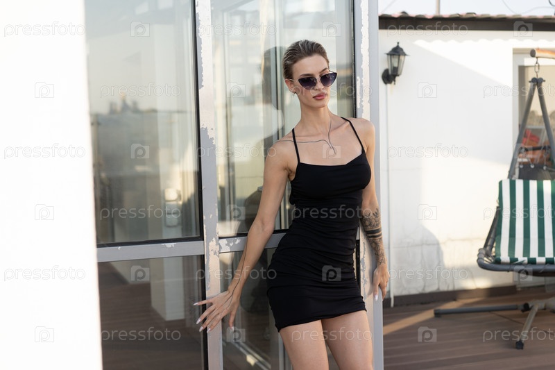 Молодая красивая женщина позирует в черном коротком платье на улице
