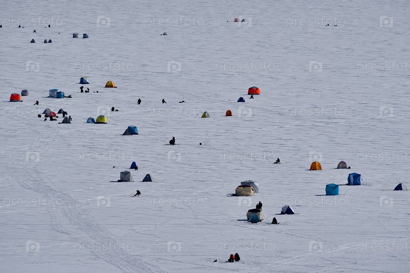 Россия. Юг Красноярского края. Ранним зимним утром рыбаки ловят рыбу на заснеженном льду водохранилища на реке Берег недалеко от города Шарыпово
