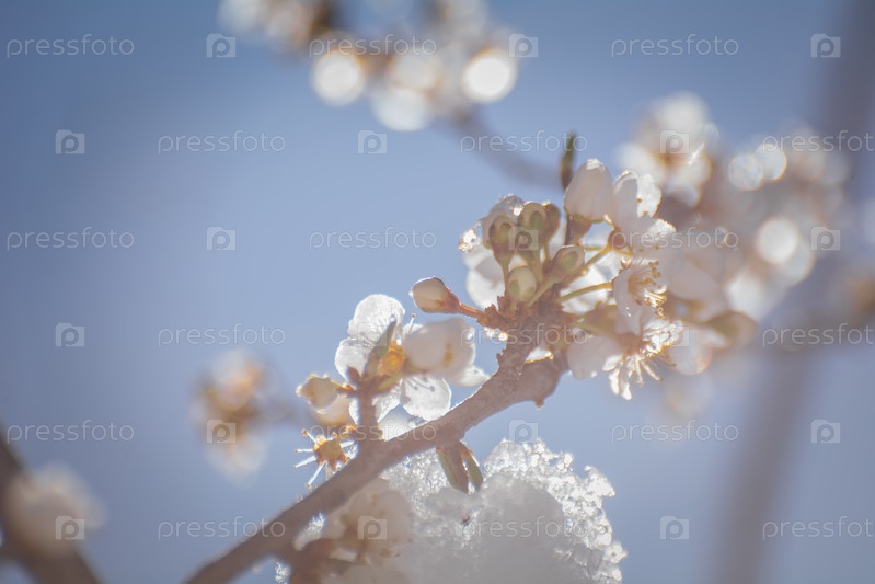 Весенние заморозки, абрикосы и яблони, цветущие под снегом