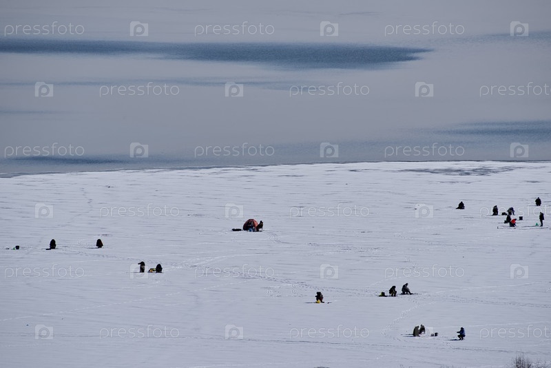 Россия. Юг Красноярского края. Ранним зимним утром рыбаки ловят рыбу на заснеженном льду водохранилища на реке Береш недалеко от города Шарыпово