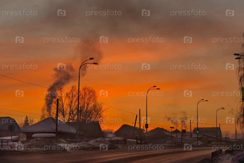 Новокузнецк, Россия. Юг Западной Сибири. Багровый живописный рассвет над дымящими трубами деревянных домов в придорожном поселке