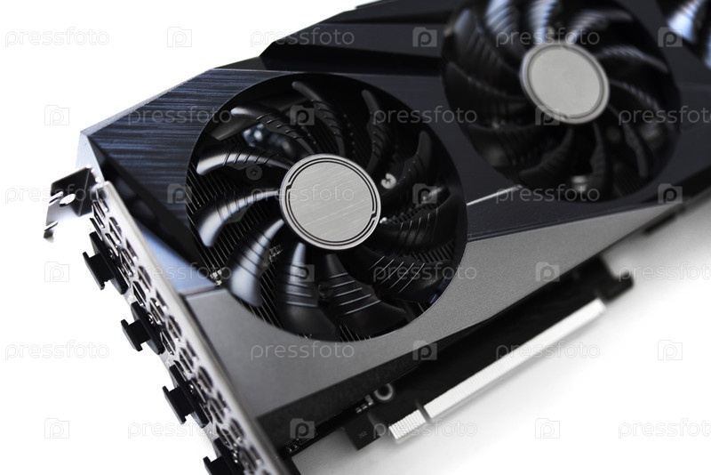 Черно-белая видеокарта на белом фоне. Вентиляторы и корпус видеокарты. Компьютерные аксессуары