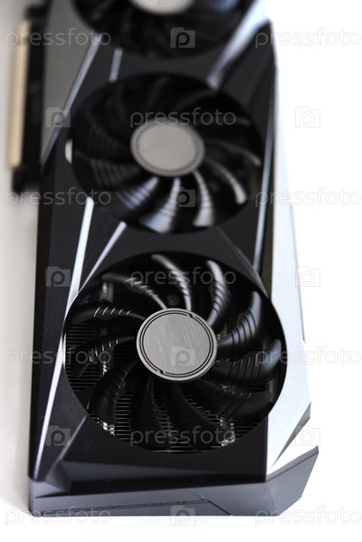 Черно-белая видеокарта на белом фоне. Вентиляторы и корпус видеокарты. Компьютерные аксессуары