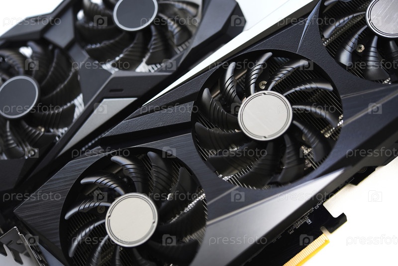 Черно-белая видеокарта на белом фоне. Вентиляторы и корпус видеокарты. Компьютерные аксессуары