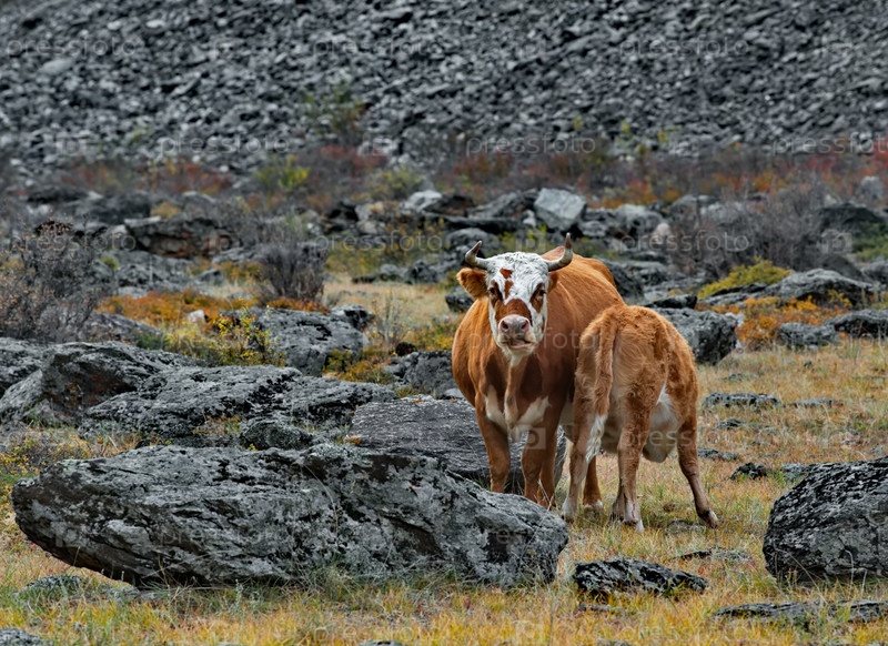 Россия. Горный Алтай. Небольшое стадо коров мирно пасется на осеннем пастбище в каменистой долине реки Чулышман