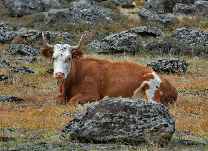 Россия. Горный Алтай. Небольшое стадо коров мирно пасется на осеннем пастбище в каменистой долине реки Чулышман
