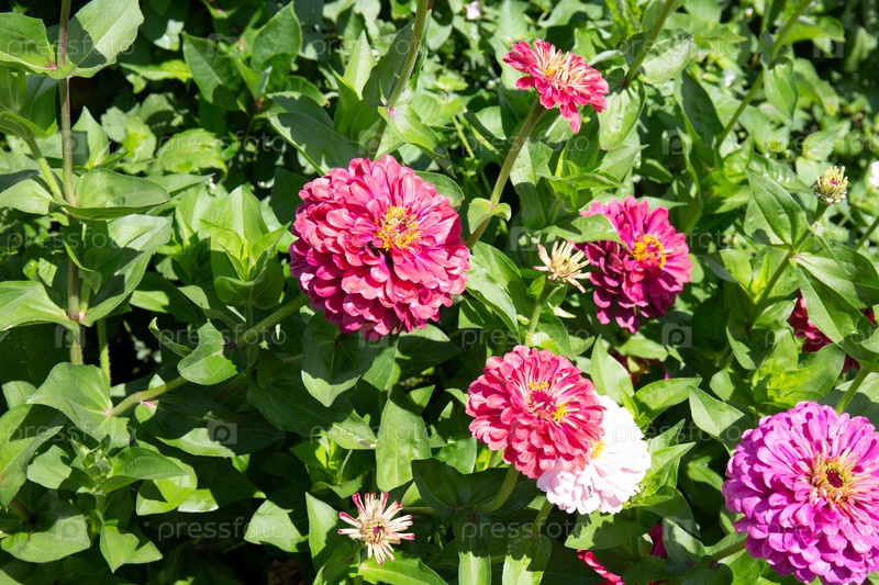 Цветы циннии элегантной в саду на фоне зеленых листьев летом