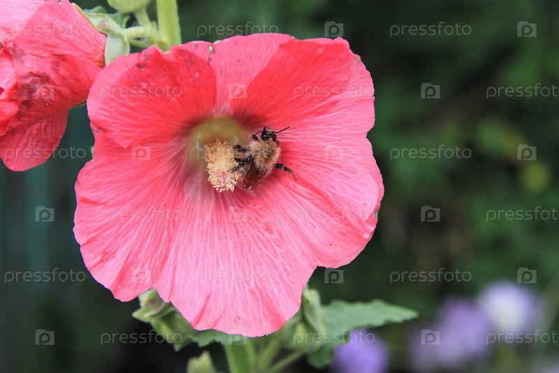 Медоносная пчела на розовом цветке мальвы в саду летом