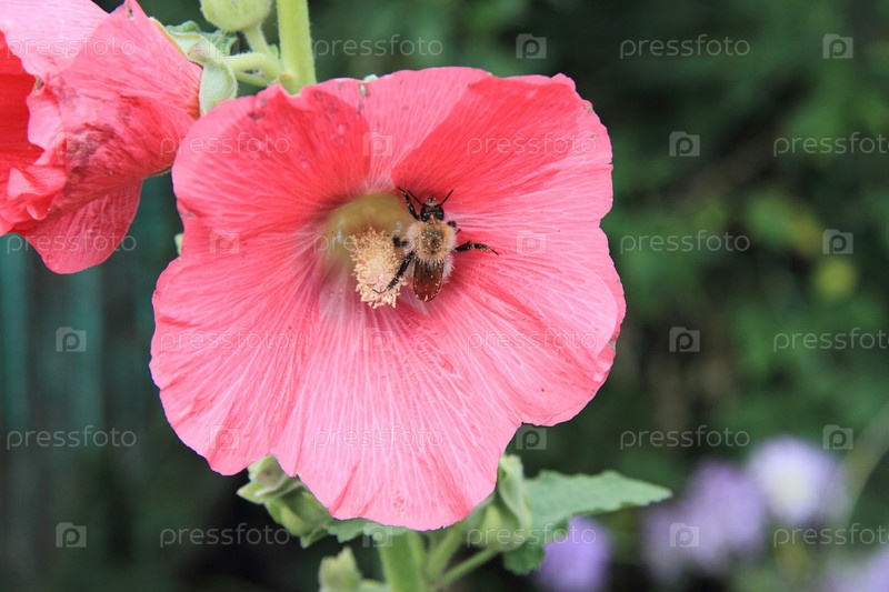 Медоносная пчела на розовом цветке мальвы в саду летом