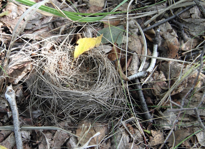Птичье гнездо на земле в лесу. Крупным планом летом