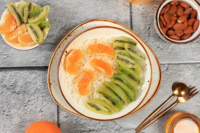 Здоровый завтрак с ингредиентами, рисовый пудинг с киви, медом, мандаринами и миндалем. плоская планировка, концепция здорового и натурального питания, образ жизни, еда для детей