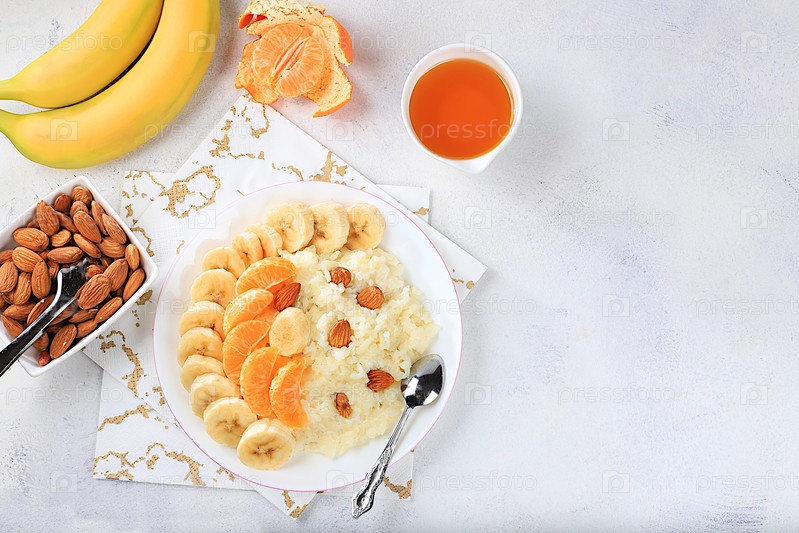 Здоровый завтрак с ингредиентами, плоская планировка, рисовый пудинг с бананами, медом, мандаринами и миндалем на солнечном столе. Концепция здорового и естественного питания, образ жизни, питание для детей