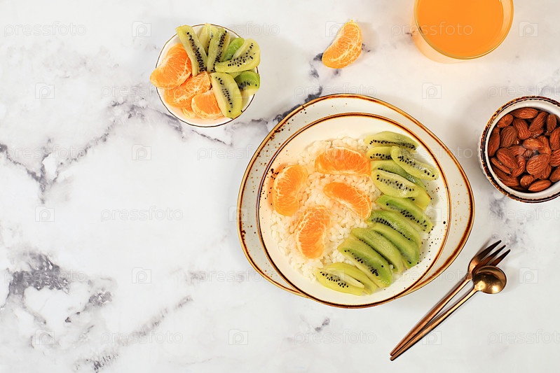 Здоровый завтрак с ингредиентами, рисовый пудинг с киви, медом, мандаринами и миндалем. плоская планировка, концепция здорового и натурального питания, образ жизни, еда для детей