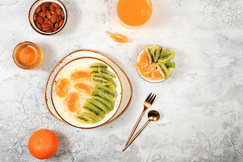 Здоровый завтрак с ингредиентами, рисовый пудинг с киви, медом, мандаринами и миндалем. плоская планировка, концепция здорового и натурального питания, образ жизни, еда для детей,