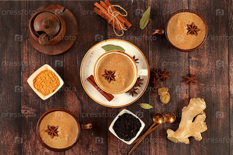 Индийский чай масала чай с молоком, имбирем, анисом и корицей на старом деревянном столе. Традиционный напиток со специями, концепция кафе, реклама ресторана и меню