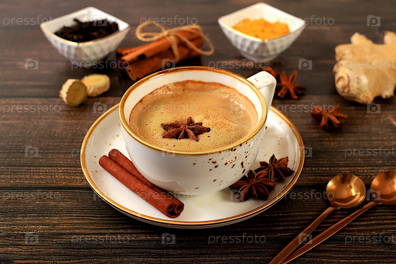 Индийский чай масала чай с молоком, имбирем, анисом и корицей на старом деревянном столе. Традиционный напиток со специями, концепция кафе, реклама ресторана и меню