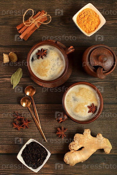 Традиционный напиток со специями, индийский чай масала чай с молоком, имбирем, анисом и корицей на старом деревянном столе. концепция кафе, реклама ресторана и меню