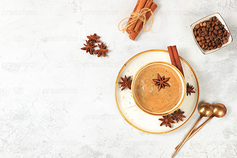 Чашка кофе с молоком, имбирем, анисом и корицей на старом бетонном столе. Традиционный индийский напиток со специями, концепция кафе, реклама ресторана и меню
