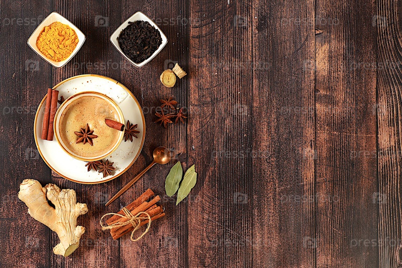 Традиционный напиток со специями, индийский чай масала чай с молоком, имбирем, анисом и корицей на старом деревянном столе. концепция кафе, реклама ресторана и меню