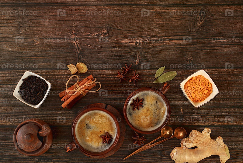Индийский чай масала чай с молоком, имбирем, анисом и корицей на старом деревянном столе. Традиционный напиток со специями, концепция кафе, реклама ресторана и меню