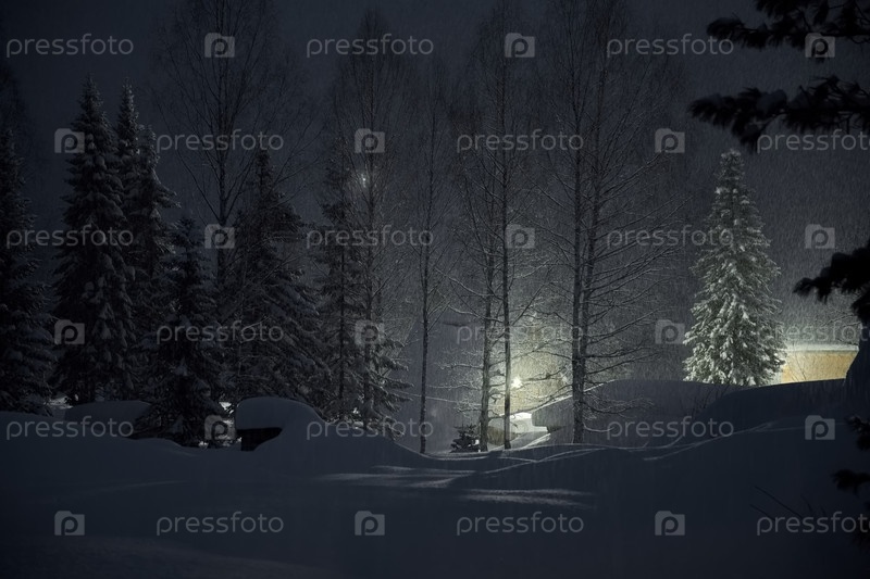 Россия. Кузнецкий Алатау. Подсвеченный фонарями ночной снегопад в горной таежной деревушке вдали от городов