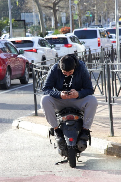 Мужчина на мотоцикле с телефоном в руках