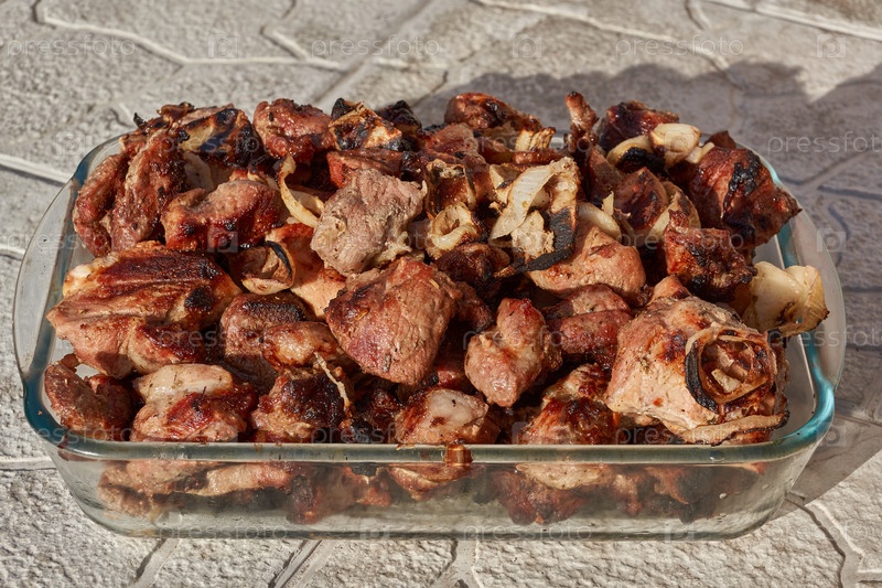 Шашлык из шампуров вынимается в стеклянную форму. Крупный план