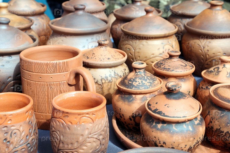 Глиняная кружка в окружении другой посуды ручной работы