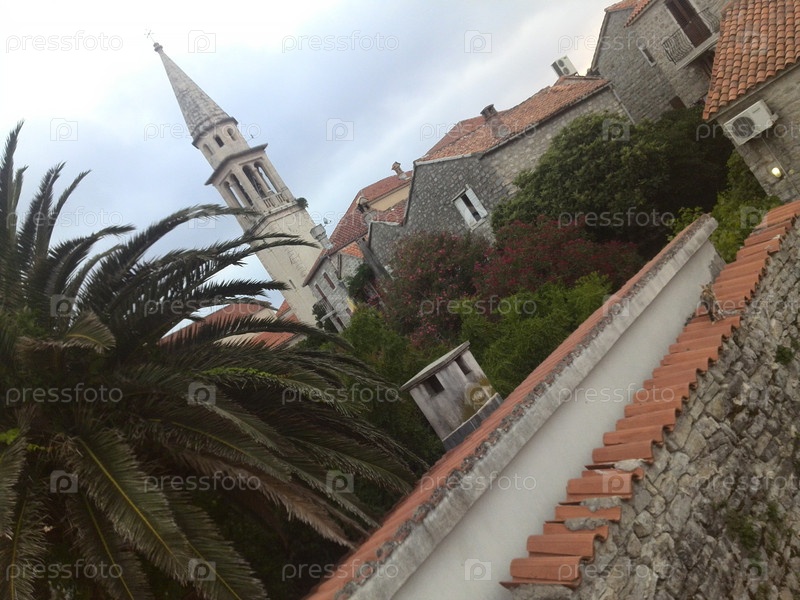 Вид на старый город Будва и колокольню Собора Святого Иоанна Крестителя: средневековый католический храм в готическом стиле