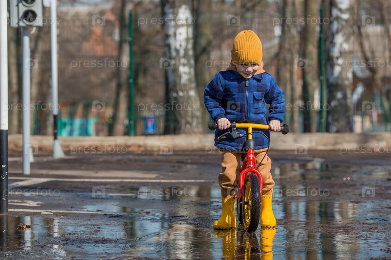Веселый маленький мальчик катается на велосипеде по лужам. Весной счастливый ребенок выходит на улицу. Малыш одет в модную клетчатую рубашку, комбинезон и желтые резиновые сапоги