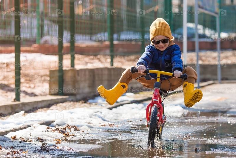 Веселый маленький мальчик катается на велосипеде по лужам. Весной счастливый ребенок выходит на улицу. Малыш одет в модную клетчатую рубашку, комбинезон и желтые резиновые сапоги
