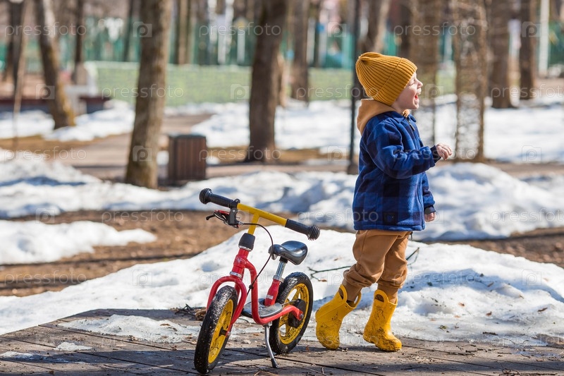 Веселый маленький мальчик катается на велосипеде по лужам. Весной счастливый ребенок выходит на улицу. Малыш одет в модную клетчатую рубашку, комбинезон и желтые резиновые сапоги