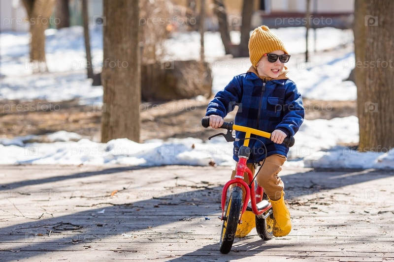 Веселый маленький мальчик катается на велосипеде по лужам. Весной счастливый ребенок выходит на улицу. Малыш одет в модную клетчатую рубашку, комбинезон и желтые резиновые сапоги