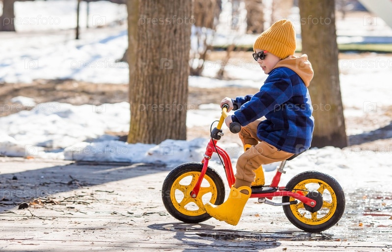 Веселый маленький мальчик катается на велосипеде по лужам. Весной счастливый ребенок выходит на улицу. Малыш одет в модную клетчатую рубашку, комбинезон и желтые резиновые сапоги