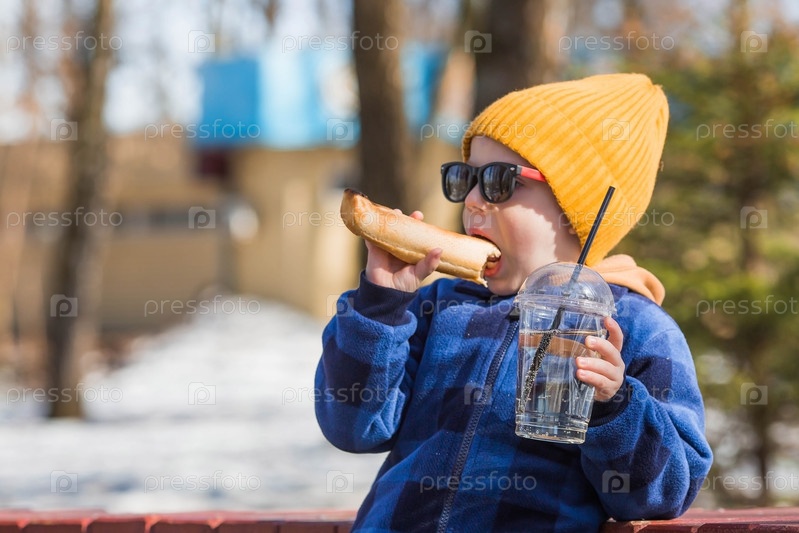 Весной маленький мальчик ест фаст-фуд на улице. Он оденет малышку в модную клетчатую рубашку, желтую шапочку и солнцезащитные очки. Ребенок ест хот-дог и пьет лимонад