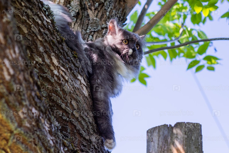 Красивая пушистая домашняя кошка поднимается на дерево в теплый летний день
