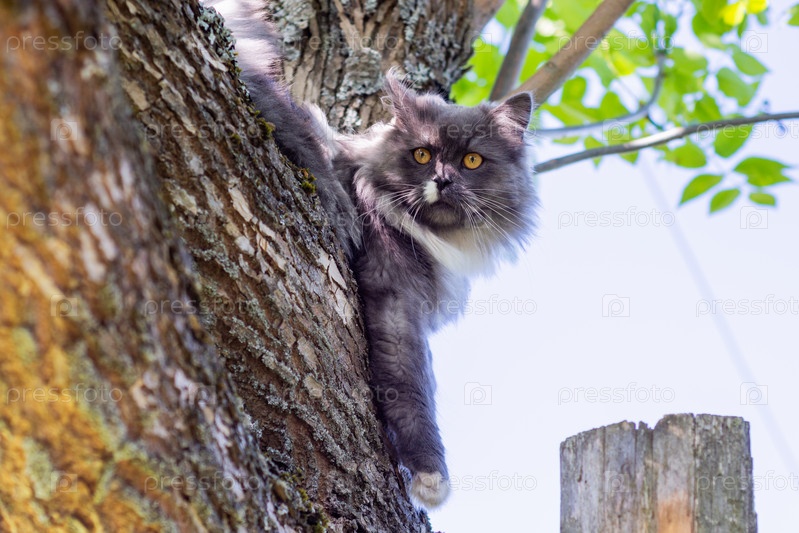 Красивая пушистая домашняя кошка поднимается на дерево в теплый летний день