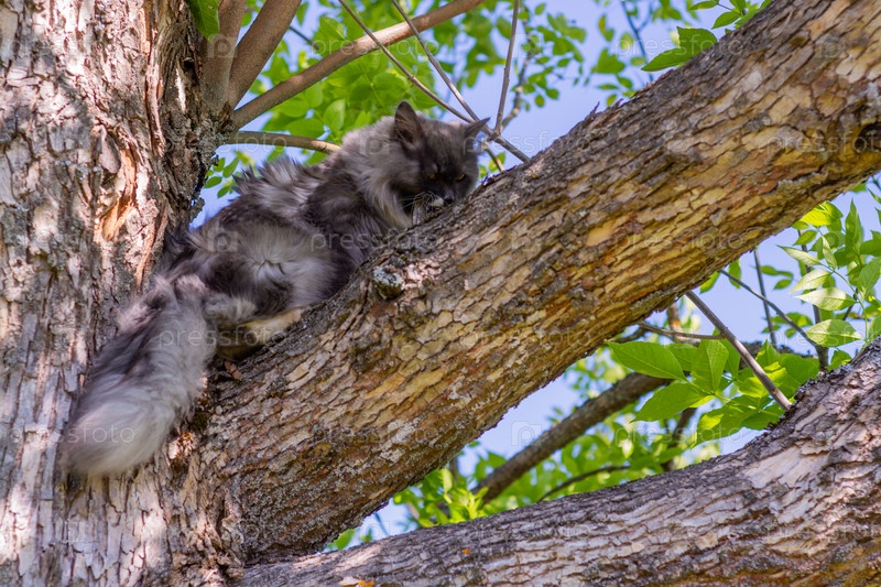 Красивая пушистая домашняя кошка поднимается на дерево в теплый летний день
