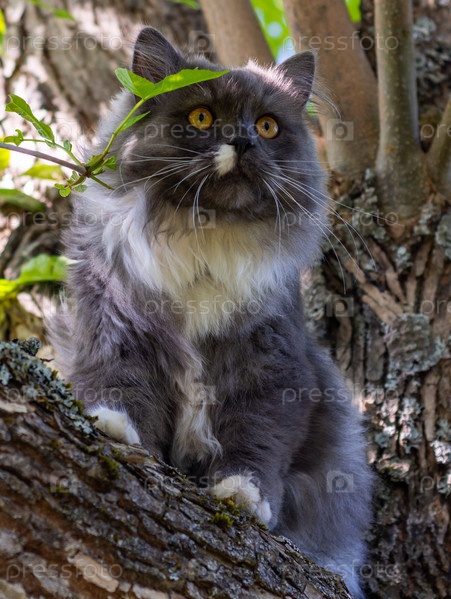 Красивая пушистая домашняя кошка поднимается на дерево в теплый летний день