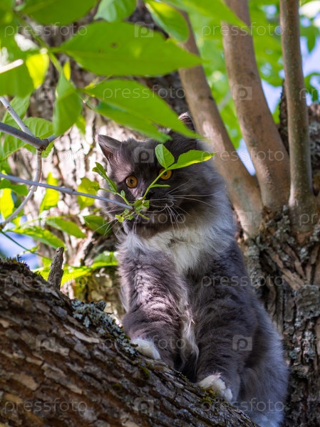 Красивая пушистая домашняя кошка поднимается на дерево в теплый летний день