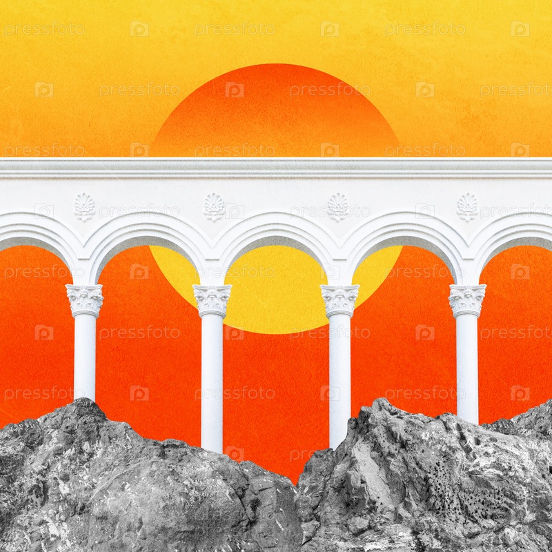 Сюрреалистический коллаж с элементами классической архитектуры. Художественный постер, концепция, обложка журнала. Античный городской пейзаж