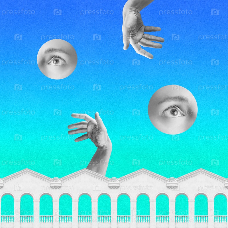 Художественный постер, концепция, обложка журнала, необычный принт. Сюрреалистический сумасшедший коллаж. Работа необычного абстрактного стиля