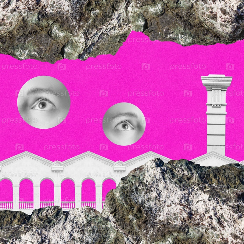 Сюрреалистический сумасшедший коллаж. Художественный постер, концепция, обложка журнала, необычный принт. Работа необычного абстрактного стиля
