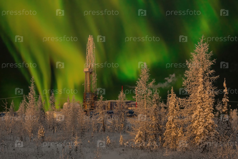 Буровая установка и северный пейзаж нефтегазового месторождения на фоне полярного сияния. Пейзаж с красивым ночным небом зимой в Арктике
